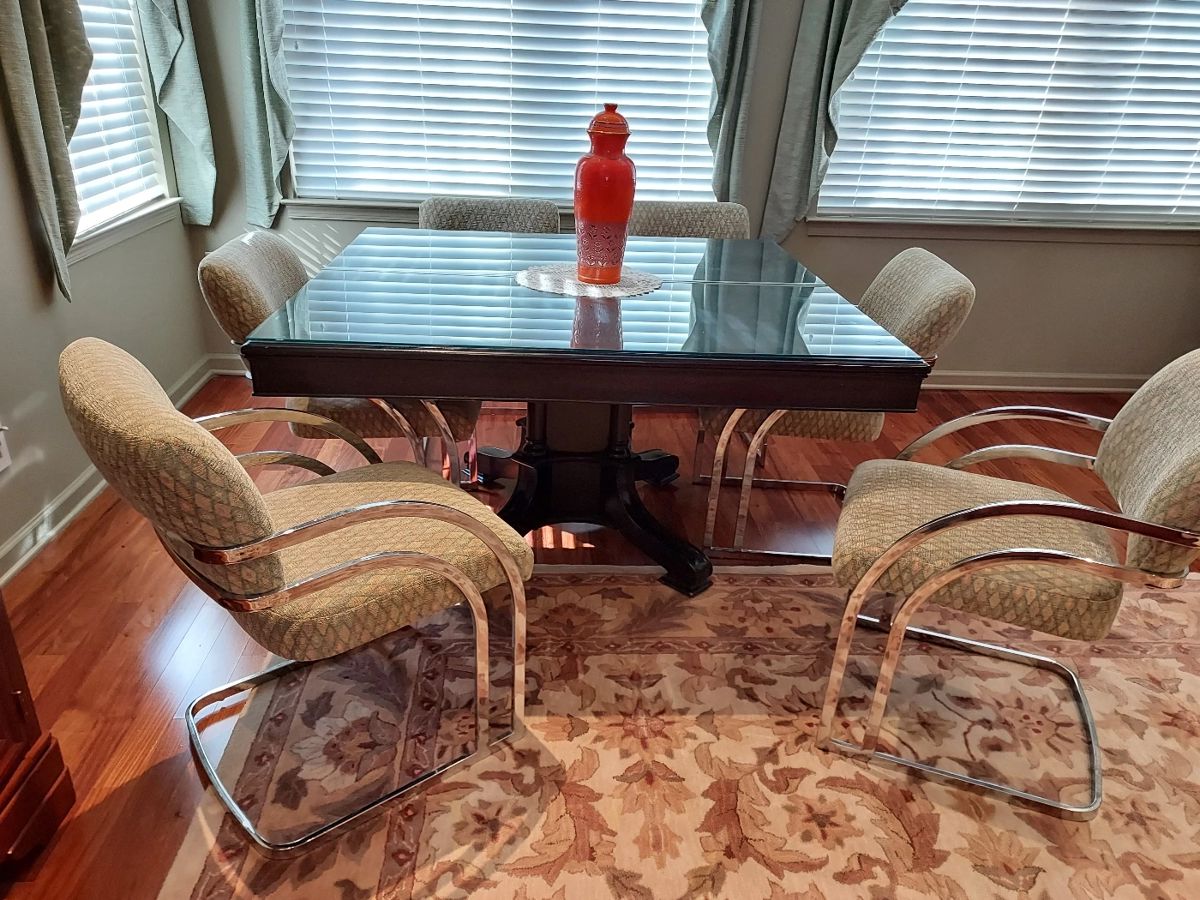 Fine Furniture, Lamps, Rugs and Art Work Dining room set with 6 Baughman mid-century chairs Oil paintings (Niko Kyte, Wilson) Classy leather sofas, brushed steel dinette set (GMI?), Furnishings by Drexel and Stanley Floating tops chrome & glass Italian coffee table 3 matching fine leather swiveling club chairs Fabulous Paul Hanson Parian and Brass lamp Several nice area rugs Men's clothes (Jos. A Bank, Tommy Bahama, Under Armour, Izod, Imus, Columbia, Brooks Bros) Men's shoes ( NB, Nike, Rockport, Sketchers) Ladies Handbags ( Coach, etc) Kitchenware, Roomba, Small appliances Several Luggage sets Left handed golf set Quality bar ware Records...