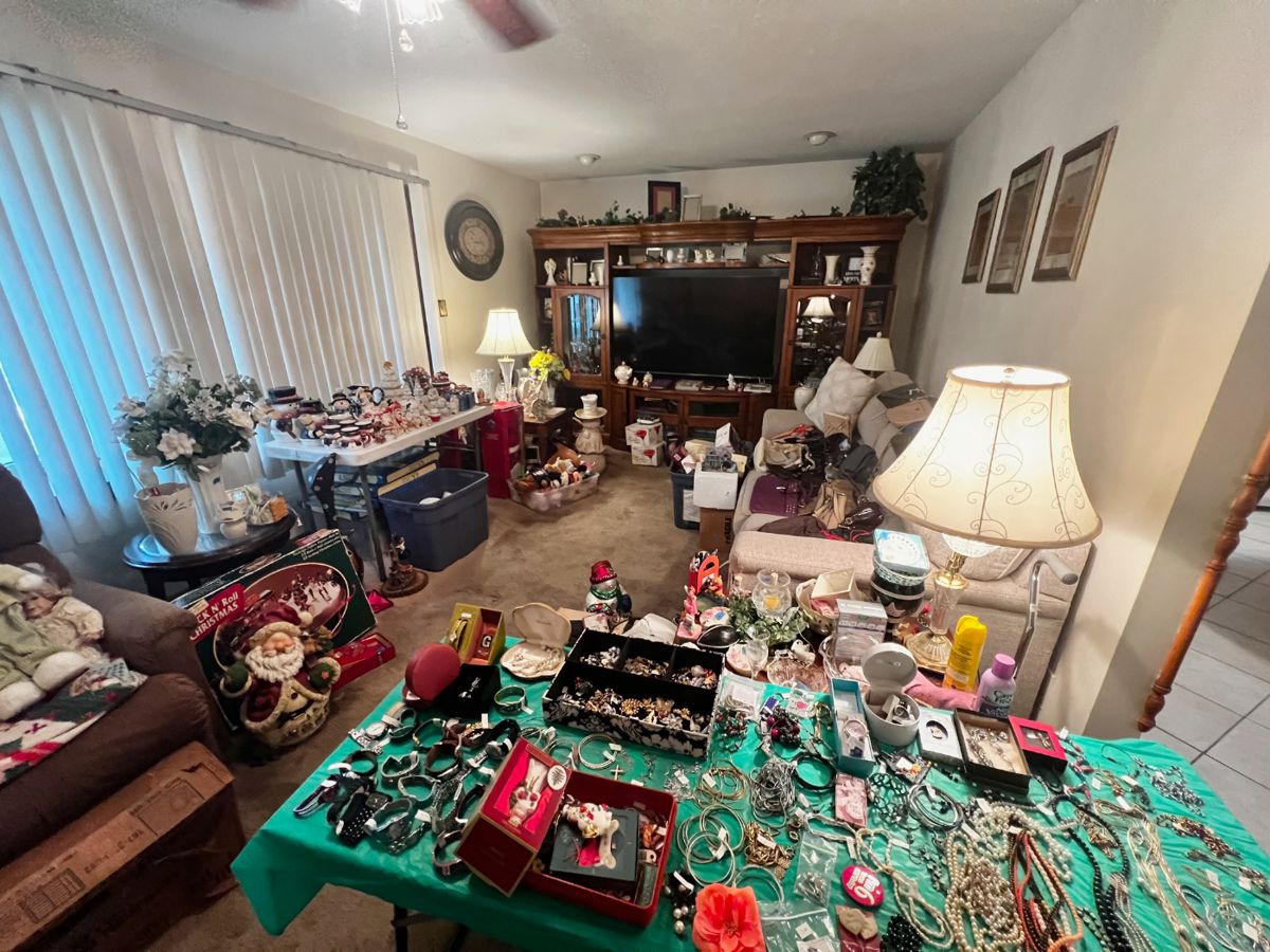 Tons of Lenox, All Holiday stuff, Knickacks, jewelry, Furniture, Lots of tools, watches, Harley parts and decor,  pots & pans, various cookware, Barbie dolls, toys, clothes, shoes, handbags, tons more.