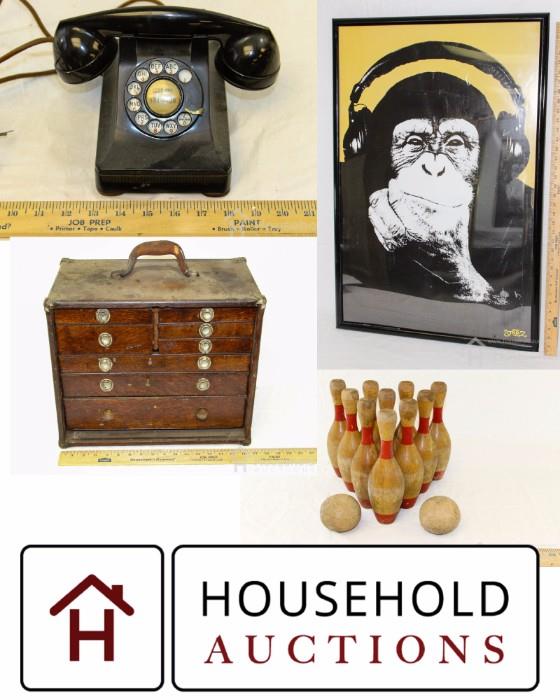 WWW.HOUSEHOLDAUCTIONS.COM THE COLLECTION IS HIGHLIGHTED IN THE COLLECTION. ADDITIONALLY, THE SALE IS A COLLECTOR'S DREAM FEATURING VINTAGE AND NOSTALGIC COLLECTIBLES SUCH AS VINYL, ELECTRONICS, AND DOLLS. $1 STARTING BIDS ON EVERYTHING! NO RESERVE! NO BUYER'S PREMIUM! Preview Friday August 28 11 am - 5 pm Preview Saturday August 29 10 am - 3 pm Sale begins to close Tuesday September 1 @ 8 pm Nationwide Shipping and Delivery Available! Visit WWW.HOUSEHOLDAUCTIONS.COM for details. Asian Style Coffee Table Tobacciana 3 Piece Cabinet Signed Matted & Framed Painting Alpine Setting 1940s Leather Top Forbert of Virginia Coffee Table Package Gold Bond Bottle...