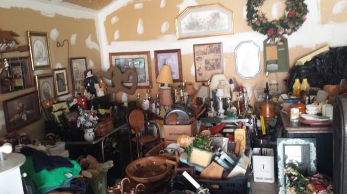 If you’re looking for something…..It’s probably here. We have tools, a brand new air cleaning system for a wood shop-still in the box. We have tons of Carhart overalls, pants, full suits, jackets…etc. We have heavy duty work pants and shirts. Fluorescent orange clothing. Lots of yellow work boots, steel tip boots too. We have TONS and TONS of interior decorating items and Holiday/Seasonal decorations. If you like milk glass…we have it!! Many kitchen items & dishes, a complete Pfaltzgraff “grape” dish collection.. Lots of Primitave country, some shabby chik. Many wall hangings, pics…etc. We have 2 tables full of...