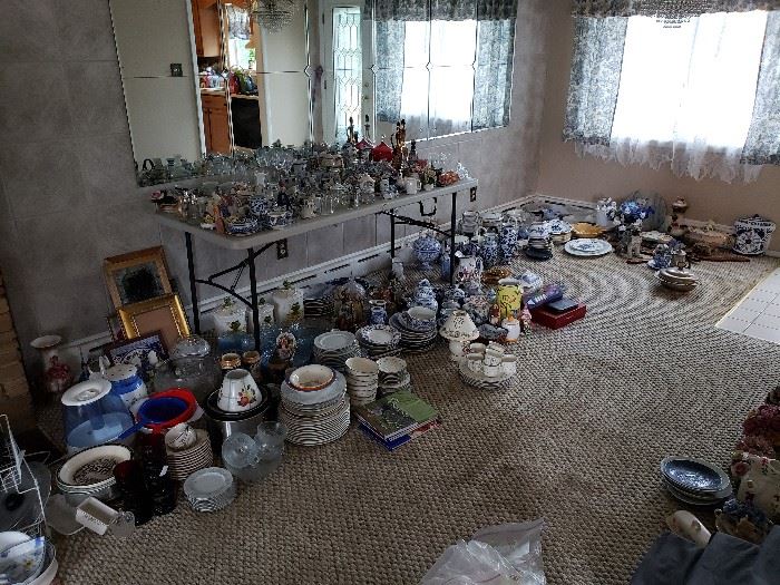 Large oriental vase, porcelain doll collection, furniture, porcelain, pottery, glassware, curio cabinets, costume jewelry, toys, xmas items, artwork, vases, statues, collectibles, lawn vases, lots of sterling silver jewelry.