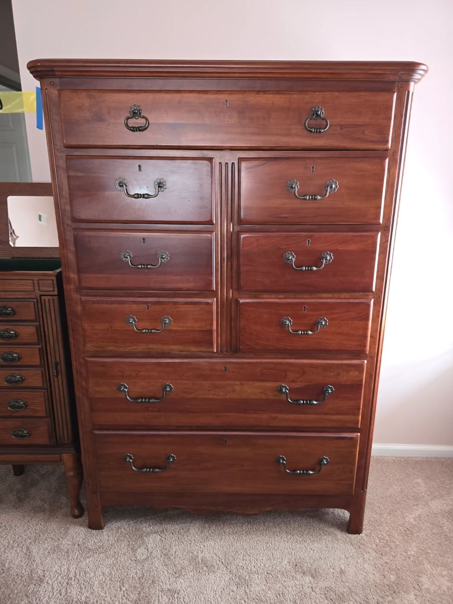 Bassett Dressers, Queen Bed with Sleep Number Mattress, Accent Pieces, Vintage plant stand, pyrex, glassware, hutch, small buffet, wall clock, costume jewelery and more....