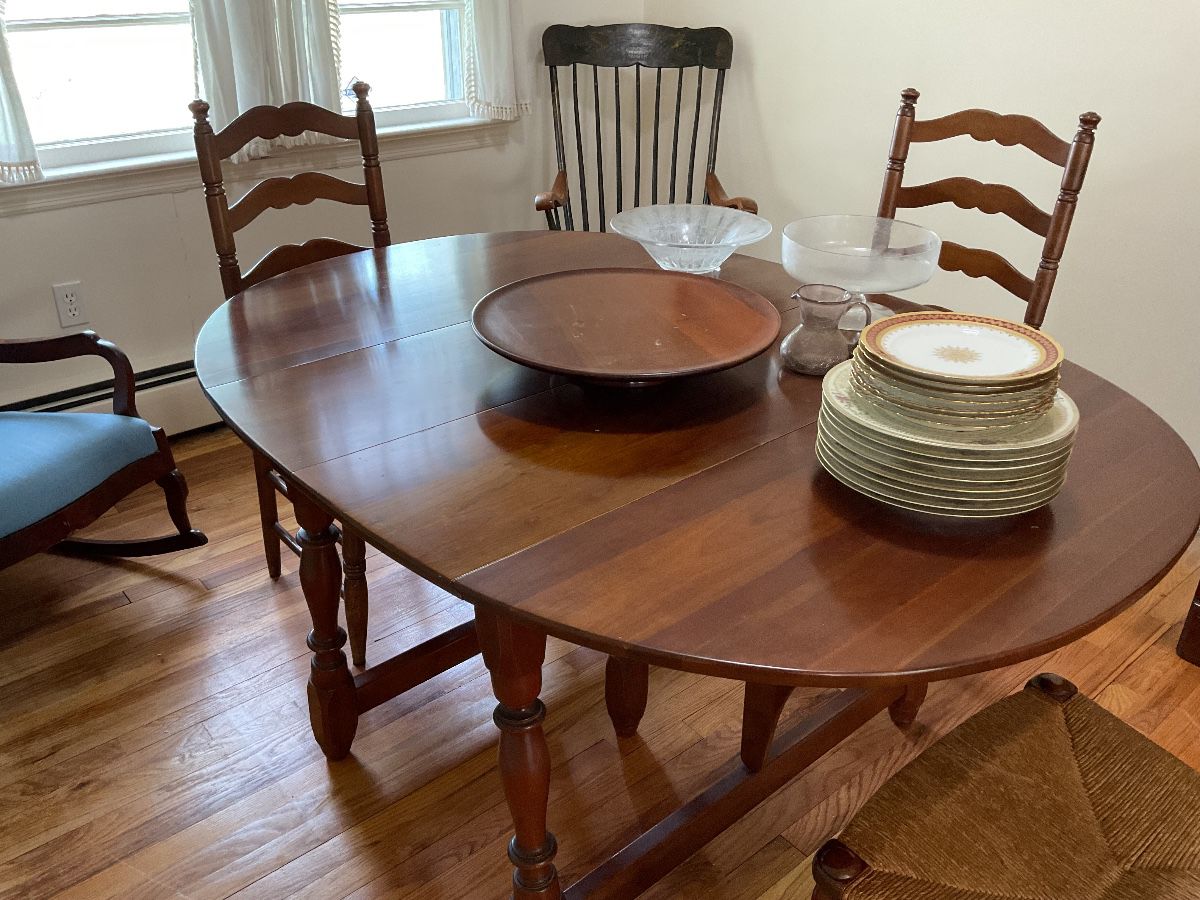 This is a lovely house in West Caldwell. The furniture and home decor is clean and in “ready to use” condition. Some of what you will find at this sale is as follows: Solid cherry drop-leaf, gate leg dining table with leaves and matching hutch, by Monitor Furniture Co., Four ladder back, rush seat chairs., Braided oval rug., Oak kitchen table with leaf and four Windsor style chairs., China and glassware., Goebel and other angels., Farberware pots and pans., Spinning wheel., Several rocking chairs, antique and others., Small sofa and several recliners., Several T.Vs., Wicker trunk., Antique PRUSSIAN HELMET., Pair...