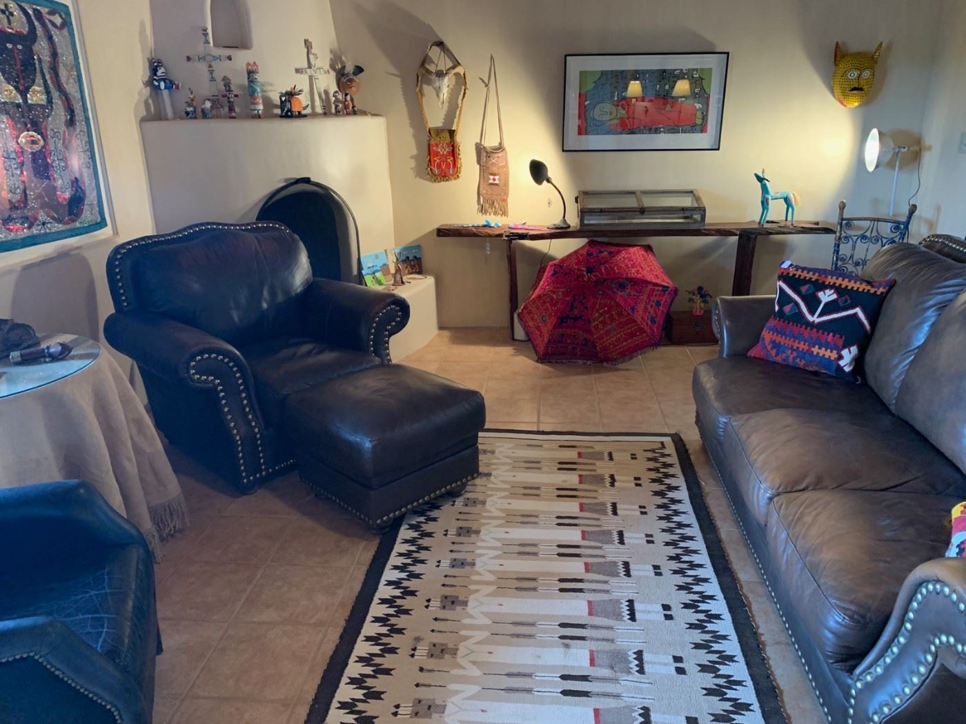 The beautiful Eldorado home, furnishings and collections of an avid folk art collector, shopper and traveller with an eye for the best of everything! ORIGINAL ART : 2 paintings by Santiago Perez, 2 spectacular Haitian Voodoo flags by Maxon Scylla, a Bill Skrips sculpture, Eldorado artist John Charbonneau, Russian icons FOLK ART: Paul Lutonsky snakes, antique retablos, a great Oaxacan alebrije, Mexican Day of the Dead and many other folk art pieces NATIVE AMERICAN ART: several Mamie Deschillie pieces, a Greg Lomayesva armadillo sculpture, a large Navajo Yei weaving, a Thomas Begay painting, kachinas, beadwork, and Hopi rattles FURNISHINGS: like...