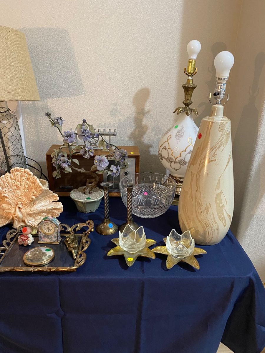 kitchen ware, living room and bedroom furniture, garage gadgets. There is wall decor , framed pictures and book shelves. Also men and women’s clothing ( regular and plus size). Sport items and vintage movie posters.