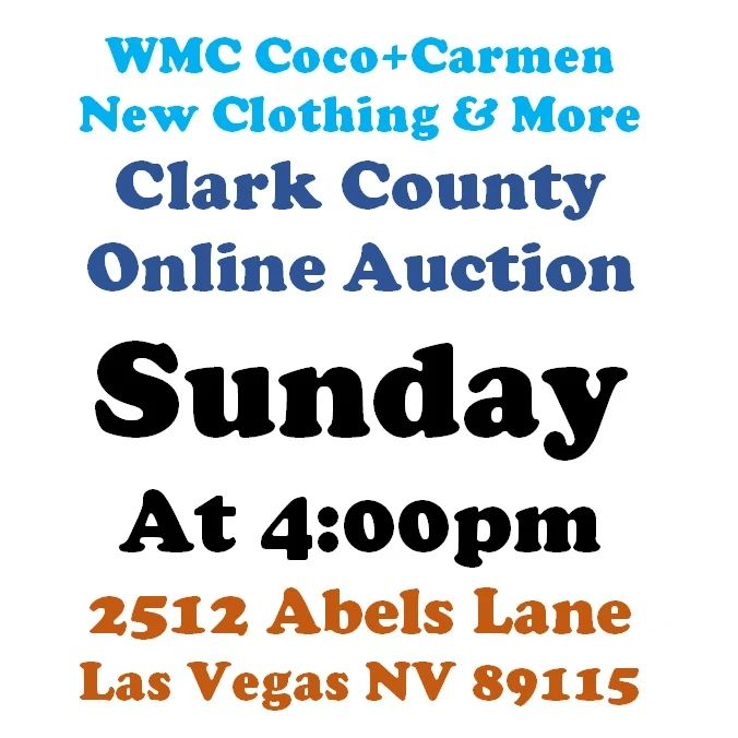 New WMC Clothing, Sandals, Handbags, Jewelry & Much More Auction - OVER 1000+ LOTS!!! MASSIVE DESIGNER CLOTHING LIQUIDATION BY COCO CARMEN, MUDPIES, SHIRALEAH, ETC., PLUS JEWELRY, GEMSTONES, HOME DÉCOR, CANDLES, GIFT ITEMS, SEASONAL DECORATIVE ITEMS, & SO MUCH MORE ONLINE PUBLIC AUCTION!!! https://lasvegasauction.hibid.com/catalog/697180/sun--4-00pm---wmc-coco-carmen-clothing-and-more-auction-12-7 SUNDAY, December 7th Starting at 4:00pm (4:00pm to 10:00pm) ONLINE BIDDING ONLY - TIMED AUCTION. ONLINE PREVIEW ONLY https://lasvegasauction.hibid.com/catalog/697180/sun--4-00pm---wmc-coco-carmen-clothing-and-more-auction-12-7 PARTIAL LIST: Over 1000+ Lots to be Sold to The Highest Bidder!!! Over 750 Lots of New Coco Carmen Clothing including Jeans, Pants, Sweaters, Shirts, & Much More Boutique Style New Clothing & Designers, Gold Jewelry, Silver Jewelry,...