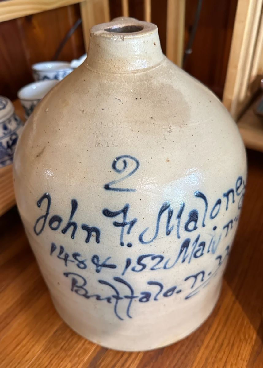 Sign-up sheet goes up when we arrive on Friday at 9ish or earlier. LOADS of blue and white dishes and decor! A fun country sale with lovely furniture, collectibles, housewares, kitchenware and more. The stars of the sale are two 2-gallon merchant script jugs made for John F. Malone, 148-156 Main St, Buffalo, NY. Made and stamped by J. Fished, Lyons, NY - they were active from 1872 to 1902. Minor chipping at mouths, but in otherwise great condition. Teacups, painted china, fun art deco chrome coffee set, pottery, stoneware crocks, two sets of Pfaltzgraff Yorktowne in brown and blue,...