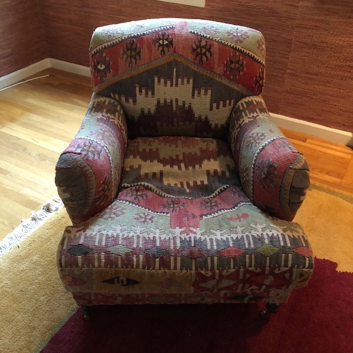Lovely Eclectic Home Quality Contents: Antique pine server, Antique pine bench with spindle back, Wall mounted Antique wooden Industrial Spool rack, Unique terra cotta oil urns in primitive pine stand, large pine glass front bookcase/breakfront, Antique rustic pine coffee table and chest, antique dome topped chest, Pair of GEORGE SMITH Kilim club chairs, ODEGARD Tibetan rug, Dhurri rug, and other rugs, sweet Vintage country dining table and 4 Rush bottom chairs, 6 Country pine dining chairs, unique vintage excavator weathervane, decorator copper finish floor lamp, Bellini dressers and full size bed, custom sectional sofa and sleeper sectional sofa, futon, contemporary...