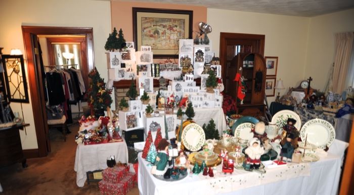 This is the cherished home of dear friends of ours. This immaculate brick side entrance colonial is full of the things she loved and purchased over the last forty plus years. Beautiful Christmas decor including vintage glass ornaments, a large collection of Dept. 56 villages and accessories, Lizzie High Santas, several sets of gorgeous Christmas china and linens, a vast collection of Hummels, Stueben, fine crystal, Syracuse, Lenox and Havilland full china sets, exquisite linens, perfect condition kitchenware, original American Dolls, clothing and accessories all in mint condition, Steiff animals, Madame Alexander, more Lizzie High dolls, beautiful costume jewelry, designer...