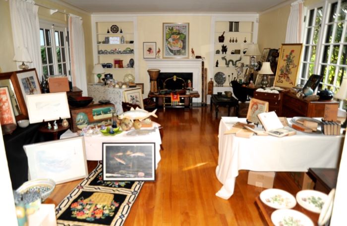 Our clients on Middlesex Road have relocated and are selling some beautiful items. He was the great nephew of Elbert Hubbard and a collection of books with some signatures are here along with other early books. Period drop front desk, exquisite dining room table, eleven French Regency arm chairs, gorgeous credenza, Oriental rug, needlepoint runner, mink coat, fine china, crystal, pottery, signed artwork, chandelier, Klipsch Heresy speakers, B & K and Adcom Hi Fi components, primitive coffee table, Asian artifacts and collectibles, antique chests, silver, marine aquarium supplies and reverse osmosis system supplies, vintage tool bench, antique trunks, butler table,...