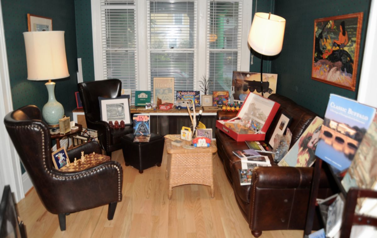 This brick row house on Highland Avenue is unique! Four floors featuring leather furnishings, Mission dining room set, Mid Century chests and dressers, beds, office furniture, bookshelves, original signed oil paintings, sculpture, watercolor and lithographs, vintage jewelry, saxophone, Buffalo books, fine china, pottery, art objects, games, Pokémon Monopoly, designer purses, stemware, a vast amount of art, fiction and history books, bicycles, wicker, vintage ice chest / cooler, electronics, vinyl, posters, and miscellaneous. Sale start Saturday! Come to all three of our Western New York sales this week: https://ednalouise.com/sales