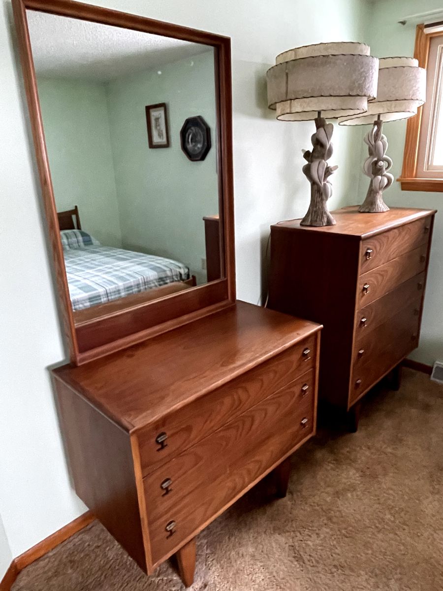 Serendipity is pleased to have been given the opportunity to find new homes for this family’s cherished belongings. It’s a tidy little house filled with general household goods and some great mid-century gems. Included in the sale are: 1960s Stanley bedroom suite, pair of chalkware lamps with fabulous shades, mod Moe Light emerald-blue honeycomb pulldown light, vintage guayabera men’s shirts, Corelle Butterfly Gold and Spring Blossom dishes, men's XL clothing, hunting and fishing (including calls), electronics, vintage Bills gear (including pair of reversible Beiderlack blankets), retro kitchenware, jewelry, pair of composition Madame Alexander dolls, many vintage swag lamps, pair of...