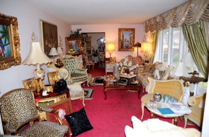 This home has been vacant for quite some time, and I will be honest in telling all of you that some serious dusting and polishing took place to prepare for a sale. The woman who lived here was a professional seamstress and one of her clients was Johnny Carson! Elegant Provincial furnishings, ornate chairs, sofas, exquisite mirrors, china, silver, curios, lamps, fabric bolts, women's clothing size 3x-5x, decorator pieces, leopard chair, records and cookbooks. Come to all three of our Western New York sales this week: http://ednalouise.herokuapp.com/sales And be sure to have the Edna Louise iPhone app!