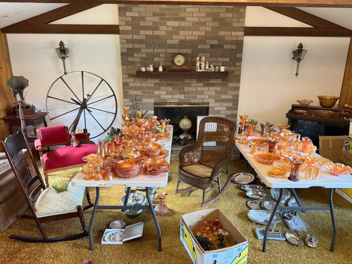 Full Contents of Home filled with vintage & unique items and Hundreds & Hundreds of pieces of Carnival Glass! The largest collection of Marigold and other Carnival Glass we have ever seen! Lots, and lots, of ANTIQUES in this home! Many nice framed, pencil signed Wallace Nutting prints; Collectible porcelain Condensed Milk jars; Silver plate and glass pickle casters; Plated & Sterling Silver; Wall mounted and other Oil Lamps, Gone with the Wind Lamps and other lighting; Milk glass; Atmos Clock; Victorian furniture including an Oak Slant Front Desk, Sofa with fringe; settee; beds and more; hand stitched vintage Quilts;...