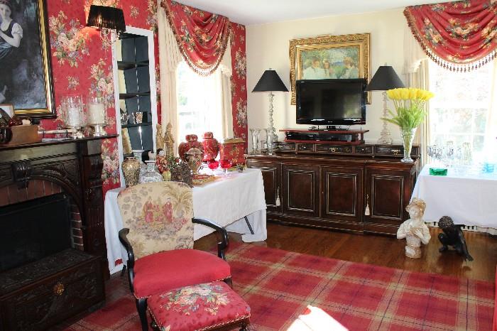 Packed Decorator's Home. ALL in Great Condition. Drexel Heritage Master BR Set,, Queen Bedroom Set, Ethan Allen Sofa,, Attractive Arm Chairs,, Antique Carved Throne Chair,, Parquetry Dining Table & Chairs,, Swarovski Chandelier,, Brown Velvet Love Seat,, Lots of Furniture Accents,, Long-Low Wood Console,, Quality Desk & Office,, Table Lamps, Mirrors, Rugs,, Diverse Selection of Wall Art,, Tons of Affordable Decorative Items with Asian and some Antiques,, Old Trunk, Pipe Collection,, Nice Holiday Decorations,, Tons of Ladies Clothes & Accessories,, Sterling & Costume Jewelry,, Some Men’s Clothing,, Kitchen, Rosenthal Glass,, Flat Screen TVs,, Detached Garage,, Patio & Statuary and More.,