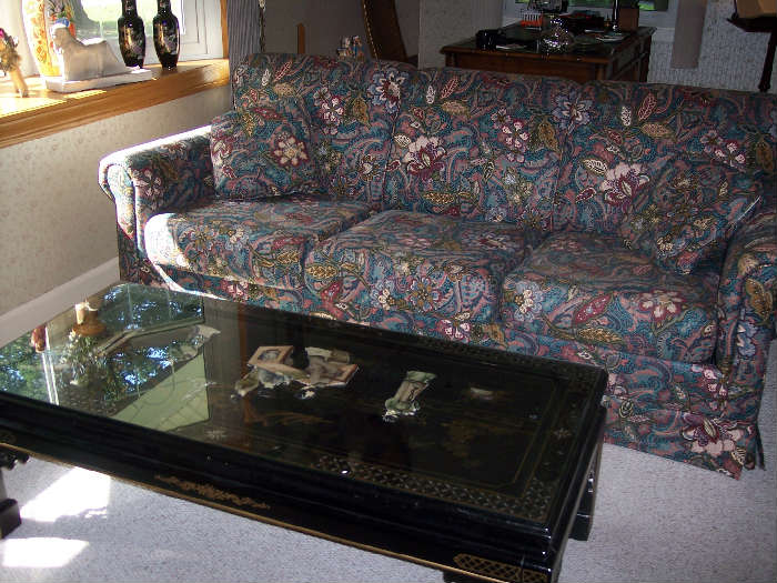 FURNITURE: Oak desks, child's iron bed, umbrella stand, bamboo end tables, tea card, Asian 3D divided room screen, Asian laquer table (3D under glass), pine diningroom table w/ 6 chairs, child's wicker chair, pine dining room table, king bed with brass head board, two night stands, wardrobe dresser, dining buffet, drop down desk, ornate chest, trunnel bed, leather vibrating recliner, recliner chair, round oriental rug, wrought iron table/chairs, octagon end tables, oak entertainment center, wood podium etc.......... INTEREST/COLLECTIBLES: Brass box, stereo equipment, music stands, sheet music, music books, recorded music cassets and tapes, composed music, books, paper items, lamps camel...