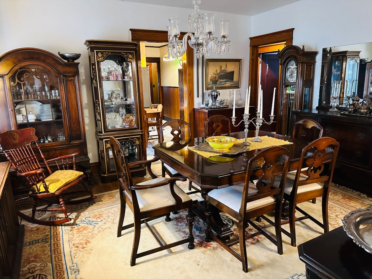 This is a generational home packed with diverse antique & vintage furniture, it will peak the interest of everyone! We have a special ornate piano made by the Ahlstrom Piano Co of Jamestown (circa 1900), 2 antique piano stools, a gorgeous walnut dining room table & chairs, 2 buffet servers, 4 different curio & china cabinets that include signed, hand painted Maddox, Union National and depression. There are many floral handpainted wood valances over the windows that we are selling. Oak kitchen table and chairs, that Hoosier cabinet (painted white)that you’ve been looking for! Many, many vintage dressers & chests,...
