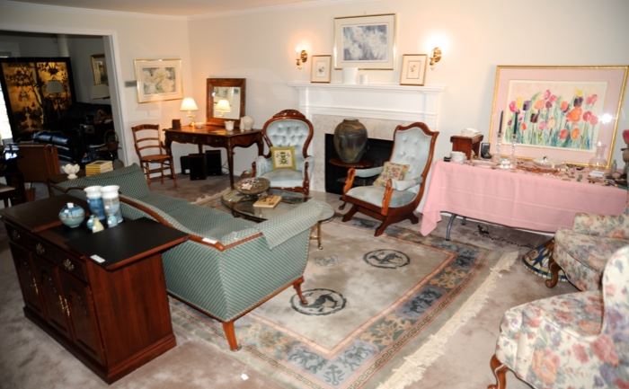 Half price Friday! We are open today !This lovely Lockport sale has fine furnishings, antiques and collectibles. Camelback sofa, Victorian gentleman's and lady's chairs, mahogany executive desk, wingback chairs, Oriental carpets, leather sofa and loveseat, dining console and china cabinet, marble top Eastlake dressers, ladies writing desk, occasional tables and stands, bedroom suites, newer Baldwin console piano, Oriental screen, signed artwork, costume jewelry, designer women's clothing and accessories, beautiful lamps, fine china and stemware, kitchenware and entertaining supplies, silvered pottery. The basement is very large and features a master bedroom and library. Early Mission Oak table, Windsor chairs and two...