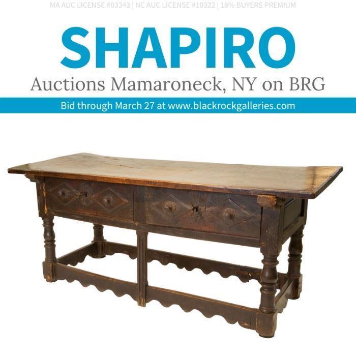 SHAPIRO AUCTIONS MAMARONECK NY ON BRG SALE BEGINS TO CLOSE MONDAY, MARCH 27 AT 8:45 PM EST LOCATION: WESTCHESTER, NY 153 ITEMS VIEW ALL ITEMS & BID ONLINE AT WWW.BLACKROCKGALLERIES.COM BRG is pleased to offer this Shapiro Auctions’ Mamaroneck, NY collection of fine antiques and furniture, sterling silver, fine art, rugs, and other decorative arts. Happy bidding! VIEW ALL ITEMS & BID ONLINE AT WWW.BLACKROCKGALLERIES.COM *The items in this auction are available for BRG warehouse-to-warehouse transports for easy local pick-up at any BRG location: Bridgeport, Greenwich, Boston, Raleigh, or Dallas. See website for details. **The members of the BRG jewelry...