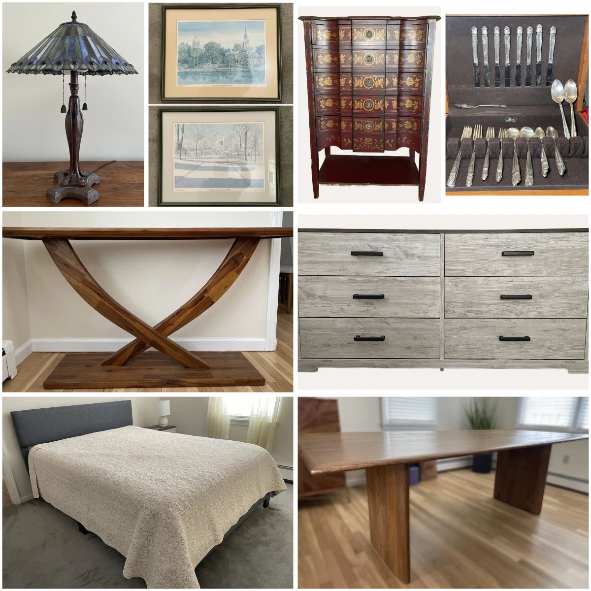 Blue Moon Estate Sales of Westchester is proud to present our next downsized estate auction at this beautiful, cozy house in Mamaroneck, NY. We start with furniture from Ashley Signature Design: Shawburn 6-Drawer Dresser and 1-Drawer Nightstand.Bedroom: Queen-size bed with grey fabric headboard and wood slat base; Vintage wooden spindle/Jenny Lind twin-size bed. Office & Living: Early American style maple wood writing desk with chair; Vintage Tell City maple arrow back rocking chair; Mid-century modern round wooden end table. Storage & Display: Sarreid Italian-style highboy chest of drawers; Chippendale style mahogany chest; Antique wooden curio cabinet. Fine Dining & Entertaining:...
