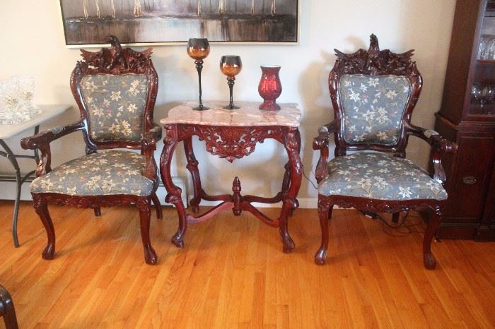 House Sold-downsized, all remaining furniture for sale: Kitchen Table w/leaf 5 chairs,, Mahogany DR table only, Upholstered side chair, Carved Eagle Captain Chairs,, Carved Marble top side table, end tables,, Assorted stemware, glassware, dish ware,, sm appliances,, Antique Buffet,, Oak side chair,, Camcorder,, Christmas items,, Variety of wall decor, 30+/- Precious Moments figurines,, Disney movies DVD, and 8 Track Movies., Raleigh Rampar R-1 110 speed road bike, C, Children Books & Puzzles,, Some garden tools,, Vintage matchbox & hot wheel cars, Some Clothing, Down & cross country skis & boots,