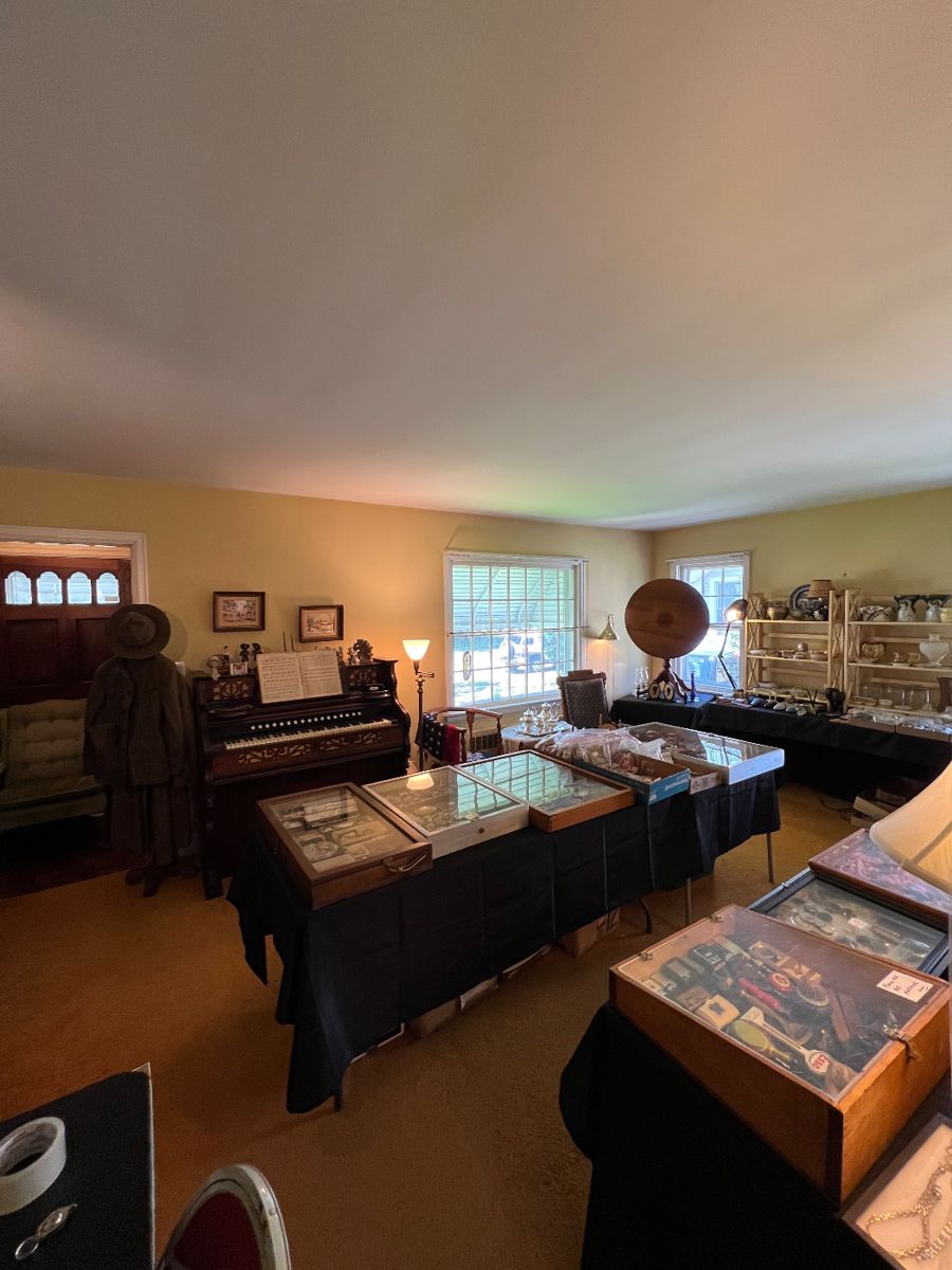 NO PRICES BEFORE SALE Cash or Credit This unbelievable sale is packed with antiques & collectibles inside and out. 3 floors in house plus garage and tent in yard. Antique furniture including early wicker plant box, Victorian tilt top table American made, serpentine front claw foot desk cabinet by Maddox Tables, curly tiger maple trunk, antique chairs, mission rocking chair, antique Halloween and Xmas items, tons of great smalls, local advertising including Wurlitzer and Carborundum and other local businesses in the area, photos, costume jewelry with some gold fill pieces, glass,pottery, porcelain, linens, Victorian lace and collars and some clothes,...