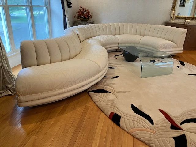 Please park on one side of street only! Thank you White serpentine sectional sofa, modern glass coffee table, lucite & glass kitchen table with 4 lucite rolling chairs, gilt mounted curio with painted panels, marble top mounted credenza, cane vanity bench, dining room table & chairs with matching china closet, Asian style china closet, marble top carved console, inlaid mounted marble top sideboard, pair of bergère chairs, marble top drum & other assorted tables, side chairs, mahogany console, settee, burled chest, tufted king bed, vanity, pair of Bombay nightstands, gilt carved mirrors, Provincial dresser, white sectional, lots of decorative accent...