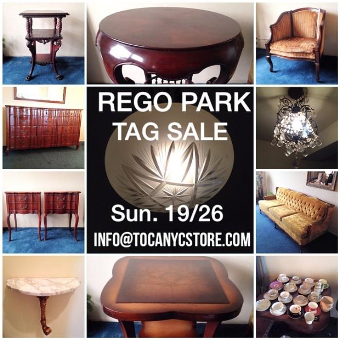 Tag Sale by Toca Nyc Store - BY APPT ONLY Sunday April 19 and finalizing it April 26. We have limited space in this small condo, so we are making it by appt. only for April 19th. All vintage items are for sale mostly furniture to include cherry wood dresser, end tables, matching mirror, vintage sofa ( kept in plastic ) 2 bergere side chairs, big size end/ tea tables with very interesting wood design. ( 1 round / 1 square ) can be used as a small dining table - 2 eclectic small hanging lamps/chandelier, assorted mirrors, small entry...