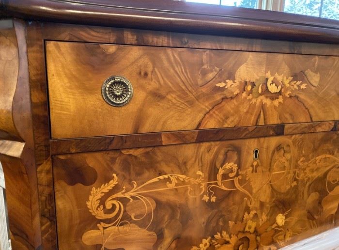 Gorgeous! Featuring Fine Furnishings & Rugs NB: carriage house will open at 9:30am. The house will open at 10am and will be shoes-off for the main floor. We appreciate your understanding & cooperation. Vintage Italian Inlaid Furnishings including Matching Pair of Bombe Dressers, Tall Cabinet Writing Desk with Hidden Drawers, Corner Cabinet with Glass Front and Fabric Interior Back, Fancy Chests — all in Mint Condition. Upholstered & Leather Furnishings from Ethan Allen, Sherrill, Hickory Chair & Stickley. Sofa, Loveseats, Side & Occasional Chairs. Mint Condition. American Drexel Dining Table with 4 Leaves & Pads. American Ethan Allen Dining Chairs,...