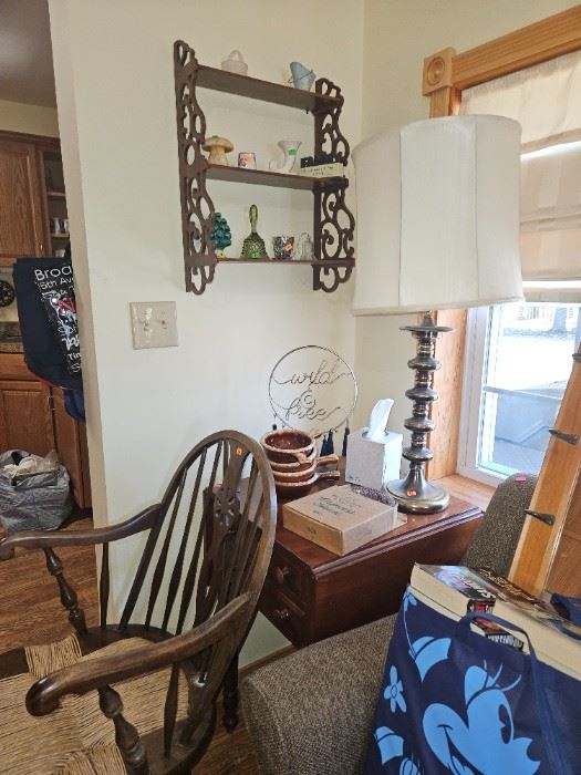 This countryside retreat is full of treasures and generational surprises!! Vintage and antique furniture and furnishings throughout including assorted antique two drawer end tables, oak pedestal dining room table with 6 chairs, oak drop leaf table with chairs, antique Windsor arm chairs, assorted lamps and lighting, mini oak bow front curio cabinet, quality sofas and love seats. Occasional upholstered parlor chairs, a variety of quality area rugs, a large variety of kitchenwares including small appliances and Revere plus vintage pieces, Pyrex and Correlle wares. Copperwares, cutlery and utensils. Quality bed and table linens plus some quilts and braided rugs. Large...