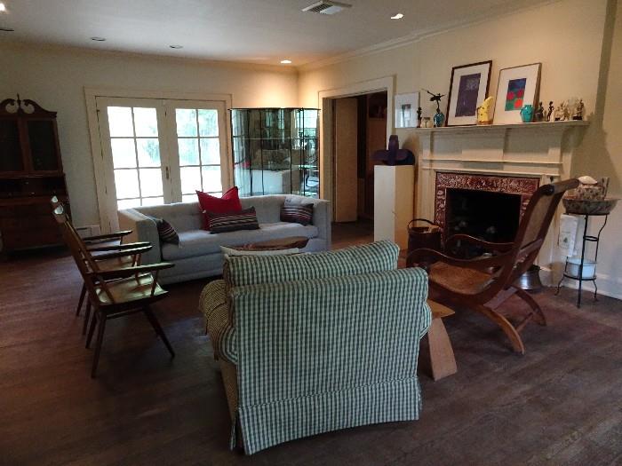 Collector's home selling a wonderful eclectic mix including mid-century and antique pieces, all must go! Furniture including fabulous pair of George Nakashima arm chairs, sofa, club, side chairs and stools, rectangular double pedestal iron base dining table with 6 Nakashima style dining chairs, Antique secretary, Contemporary demilune glass display cabinet, Bedroom pieces including daybed, shabby chic armoire, white wicker bed, dresser, desk, mirror and night stand, daybed, Bricabrac, kitchenware, China, crystal, Mirrors, rug, Men's clothing, linens, Costume, sterling and 14K jewelry, Sculptures, lots of framed artwork, Records, electronics, Lots of books including leather bound and antiques, Assorted outdoor iron tables...