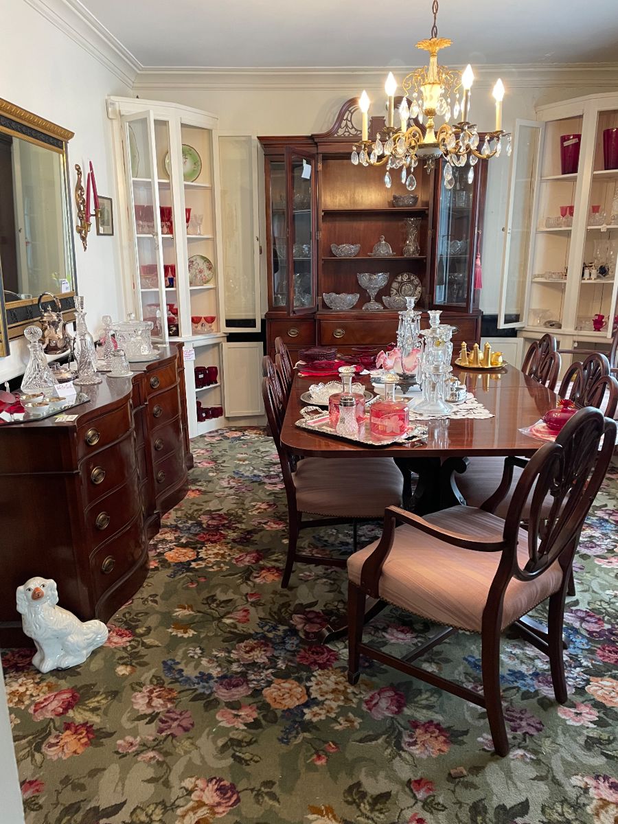 Fabulous Estate Sale packed! A Sale not to miss!! *Drexel Mahogany Dining Table with Six Chairs, two leaves, two Servers, Breakfront; Kling Cherry Bedroom Chest, Highboy, pr. Night Stands; Carved Asian Teak Stands. *Baccarat Candelabra; Heisey Williamsburg Crystal Candelabras (several); Bohemian Lusters Cut to Clear; Waterford Crystal, Shelley Oleander Cup/Saucer Collection; Royal Copenhagen Figures; Cobalt Cut to Clear Punch Bowl with Cups; Hanging Slag Glass Dining Lamp, Cut Glass Table Lamp and other Lamps, Mirrors, Organs. *Gorgeous American Brilliant Period Cut Glass (many pieces and some signed); Cranberry Opalescent, lots of Art Glass, Paperweights, Imari, Chinese Celadon, Asian Art and...