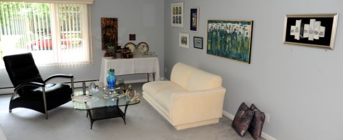 This beautiful one day sale includes Newtrend modern dinette set, Weiman sofa from the Manhattan Collection, Ethan Allen leather recliner, Rowe occasional chair, fabulous Drexel bedroom suite is lemon yellow, signed artwork including abstract by artist Rene Rothholb titled "The Shrine", Judaic art and marble sculpture by sculptor Arlena Dittfield, stoneware, fine crystal, pottery, silver, jewelry, outdoor patio set, music, office furnishings, designer gowns and more. Come to all five of our Western New York sales this week: http://ednalouise.herokuapp.com/sales And be sure to have the Edna Louise iPhone app!
