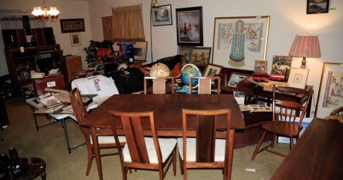 This is the estate of a single man who held on to everything the last fifty years. Included in this sale: German books, art, European electronics, clothing and collectibles. Antique drop front desk, Mid Century sectional, dining set, bedroom suite, lamps and Knick knacks, stamp collection, cameras, cigars and ashtray collection, jewelry, great vinyl collection, Telefunken Hi Fi console, turntables and quality stereo gear, signed paintings, lithographs, prints and Disney cell. Beer steins, concert and Bills t-shirts, 1970s leisure and jogging suits, quality leather men's shoes and belts, statuary, religious, a vast garage accumulation including loads of tools, ladders, power...