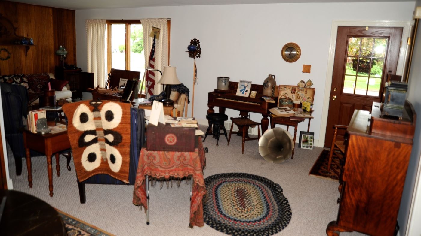 Step back in time! Several generations of collections that go back to their Pennsylvania farm and their family ties to the famous Fonda family! Beautiful antique furnishings include chests, one drawers stands, chairs, rockers, large tool trunk, many steamer trunks, beds, cupboards, farm tables, glass front book cases, primitive tools, Oriental and braided rugs, period Victorian clothing, early Native American treasures, fabulous post card and greeting card collection, early 1900s ephemera and botanical scrapbook, bisque dolls, vintage toys, fine china, crystal, jewelry, signed art, pottery, Roycroft, Navy memorabilia, mirrors, many clocks, guitars, piano, melodeon, piano stools, sheet music, books, trains,...