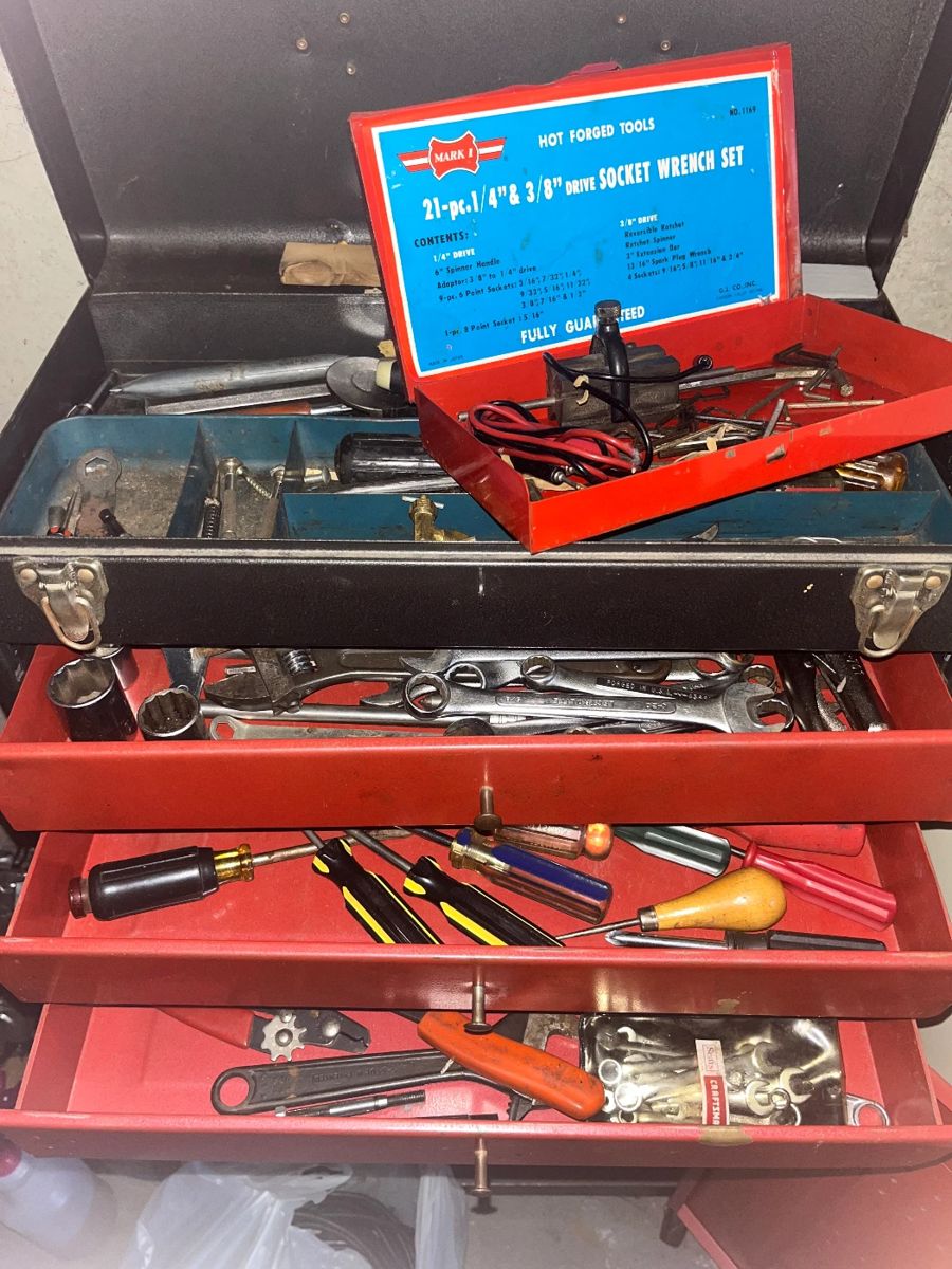 Kayak, fine Yamaha acoustic guitar, tools of all kinds, including wood-working and power tools, nautical themed items, snowshoes, sports-related items, 1970's vinyl records, 78 rpm records, 1970's comic book collection, vintage Zenith shortwave radio, liquor collectibles, antiques, antique furniture, vintage enamelware cooking items, fine Noritake Silvester china, some sterling silverware, mid-century aluminum cabinets, antique standing kitchen cabinet, antique Wheeler cast iron sewing machine, vintage mid-century Singer console machine, antique Guido Reno print, antique framed photographs, cabinet cards, tintypes, vintage and antique prints. Many electric appliances, pressure cookers for canning, canning jars, Fire-King, Corelle, mid-century furniture, beautiful like-new loveseat, too much...