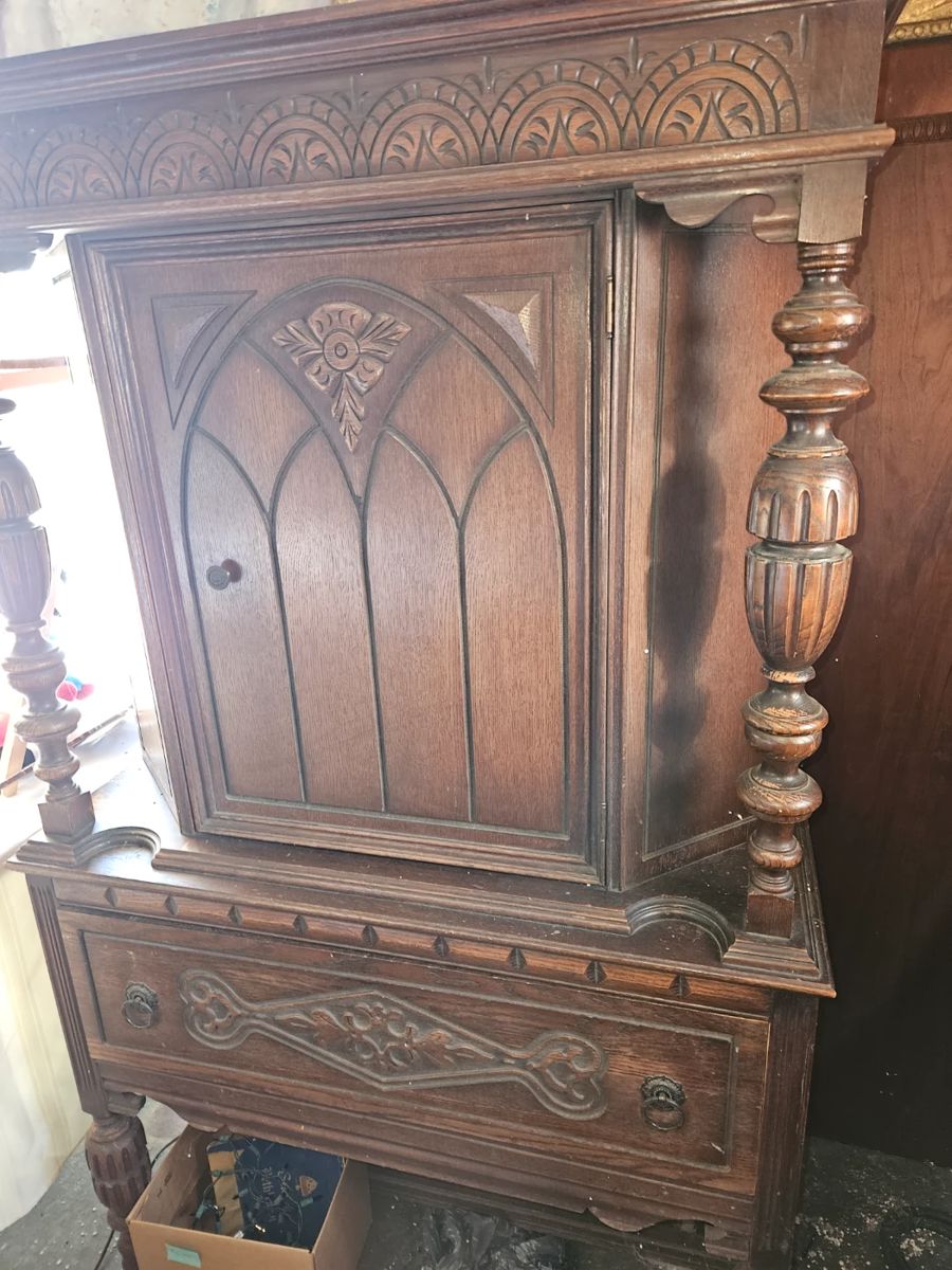 This home to long time world travelers has many unique treasures that must be sold. Two Days Only.. this Thursday and Friday... Unusual furniture and furnishing designs from Europe and Asia. Many styles represented here from Mid century to Primitives. Painted Asian room divider, antique oak library bureau, very sharp MCM coffee table, rock maple dining table set and unusual lamps and lighting. A pair of MCM sofas, a nice rock maple dining set and a more formal vintage oak dinner table with eight chairs plus a nice selection of other period occasional pieces. Several unusual framed and carved artworks...