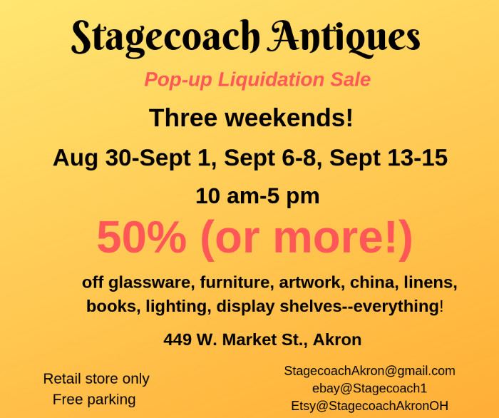 STAGECOACH ANTIQUES is liquidating our Brick and Mortar shop located at 449 W. Market Street, Akron, OH. Offering ALL Inventory and Shelving UNITS at 50% off or MORE. This SALE will be held 3 Weekends in a ROW with Greater discounts each week. SALE Dates: Friday, August 30, Saturday, August 31 and Sunday September 1 10-5 each day Friday September 6, Saturday, September 7 and Sunday, September 8 10-5 each day Friday, September 13, Saturday, September 14 and Sunday, September 15 10-5 each day As we Sell Items, more are appearing from upper shelves and in the corners--so many treasures...
