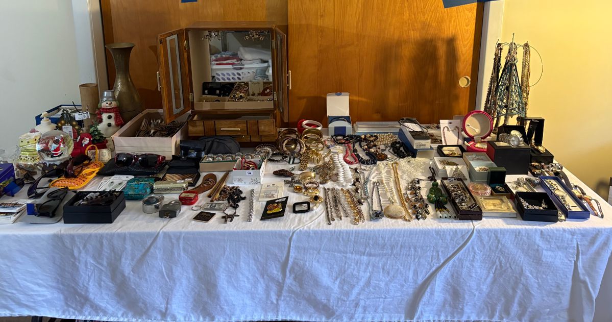 Jewelry Silver spoons Wall art, metal signs, pictures, mirrors USS Shenandoah wreckage photographs Entertainment center, glass top end tables, walnut cabinet, upholstered wingback chair, wardrobe, tv stand, desk, Virginia Maid by Lane cedar chest, twin bed, dresser, chest of drawers, wood rocking chair, mid century cabinet, upholstered couch, coffee table, tv trays, leather love seat, leather couch, marble top side table, tv stand with glass panel doors, sewing machine and table, leather arm chair, dining table and four chairs, book shelf Patio furniture with cushions - chair lounge, four chairs and glass top table Vintage military footlocker Technics SL-PD887 5-Disc...