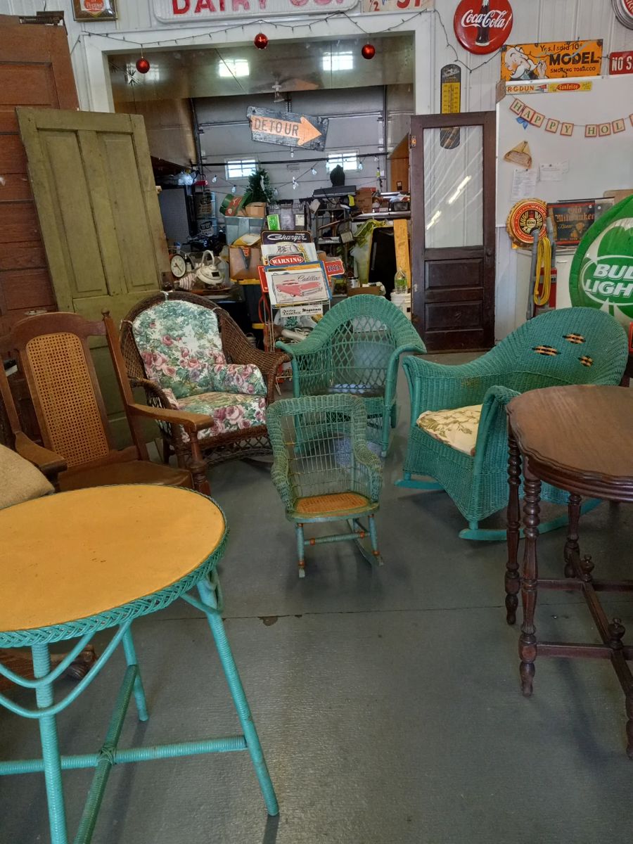 Vintage rd. store clothing rack, fainting couch,vintage wicker rockers and tables. 200+ milk bottles,bottle caps and milk boxes. Other bottles, antique doors of various sizes, trunks, pictures, etchings by Curt Frankenstein, chiffarobe, beer signs and other signs, old fans(table, floor and ceiling), rugs, horse saddle, picnic baskets, 1950's doll crib, Pepsi 2005 Yoda display (28 1/2in.tall), Cedar Point bumper car (as is ),1950's game table, some toys and games, old display cases, 6ft Coca Cola cooler, lobster trap, Tornado Foosball table, Razor scooter, Artic Cat helmets, Fold Away 20" bike, bicycles, Nordic Trac elliptical, kayak. And much much more.