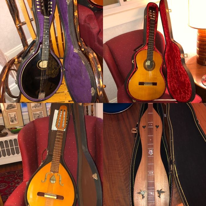 Welcome to this eclectic Cleveland Hts Home off Lee Rd 2 blocks NW of Fairmount Blvd on Scarborough. Rare Gibson Style A mandolin Number 34099 in lovely condition (but missing Gibson metal front plate) Acoustic guitar made & signed on label by M. G. Contreras Madrid 1971 (2 cracks in back). 12 string guitar or bandurria also made by M. G. Contreras. Dulcimer made by Richard & Denise Wilson. 2 fine prints signed by Agam "Beyond The Visible" & "26 colour serigraph", 1 Agam gallery exhibition poster Other fine art & prints. A little gold & other jewelry Lovely mahogany...