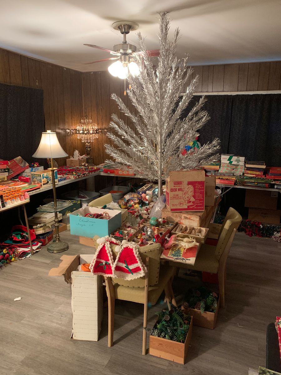 Out of the closet estate sales presents the sale of the year this is in the back house on the property this sale has pretty much everything, there is a nice selection of vintage bar wear, kitchen items, a huge selection of Jewlery and military buttons pins ect, vintage and antique furniture also a huge conection of vintage Christmas decorations and Halloween, a collection of vintage electric fans and antique vacuum cleaners,tools, some wierd stuff a big collection of vintage mid century lamps model trains, shadow boxes, cameras, audio dj equipment, glass wear, pictures, Barbie’s, lots of vintage trolls, and...