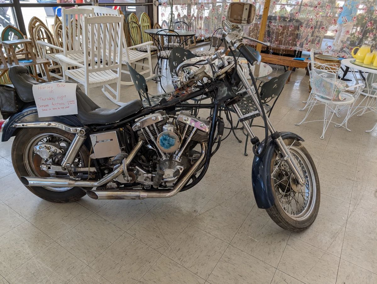 Accepting quality consignments only, call first. Call Dennis Dempsey at 440-983-1427. 1975 Harley Davidson motorcycle, model 75FXE1200 Super Glide 2003 Buick Regal LS, 27,564 miles, runs but needs work, muffler is loud, low oil light is on, needs cleaned. Mack truck collectibles, bulldog radiator caps, statues, ashtray's, clock, mini dogs, hats, mugs and more. MCM and 1970's decor, bamboo beaded curtains, Victorian cranberry castor cruet set and pickle castor. Vintage Christmas, Lenox snowman statues, Hallmark ornaments, vintage Halloween die cuts. Airplane collectibles. Vintage denim, Bengal Lancer jeans and Lee 101-J jacket. Guns include: Dreyse WW1 era Mouse bun, 22 cal,...