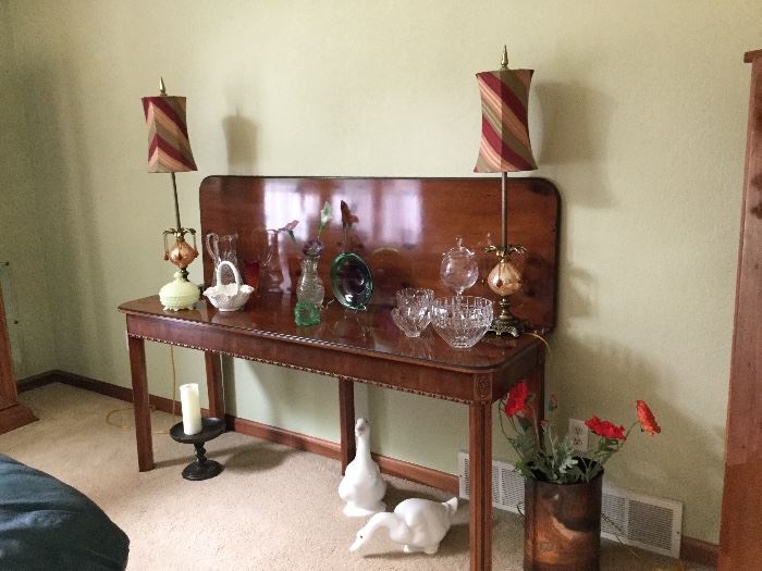 FUN AND INTERESTING SALE WITH QUALITY ITEMS: Clayton Marcus Sofa, Leather Sleeper Sofa, Arts and Crafts Rocker, Small Entry Chest, Newer Oak Curio, Dining Hutch and, Dining Table with Six Chairs, Pine Flip Top Console Table, Two Pine Entertainment Armoires, Vintage Oak Rolltop Desk,Oak File Cabinet, Oak Bench with Storage, Unusual Eastlake Washstand believed to be from a Pullman Car, Eastlake Highback Bed, Dresser with Mirror, Washstand, Bar Stools, Futon, Cradle, Wicker, Wrought Iron Patio Set, Garden Decor, Cement Water Feature, Fairy Garden Items, Weber Grill, Lamps and Mirrors(Fenton Hurricane), Home Decor, Carruth,,Longaberger, Ducks Unlimited and Tom Taber, Glassware(Waterford, Swarovski),...