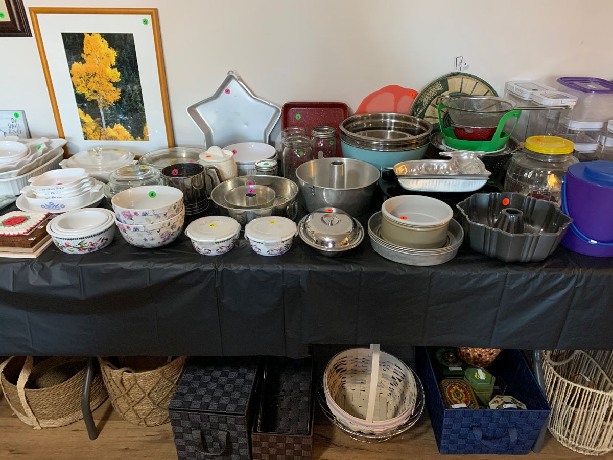 -looms, fiber (cotton, wool, linen, silk), weaving equipment, sewing machine & supplies -kitchen-dishes, baking, cooking, Insta Pot, Kitchen Aid mixer -antique/vintage crystal -antique/vintage/handmade linens -antique church pew -throw pillows & blankets, bed & bath linens -antique Drexel table, 2 leaves, 6 chairs, custom protector, & matching buffet -china hutch -industrial shelving -office supplies -recliners, antique rockers, side tables, office furniture, bed frames, dresser, kitchen chairs, cedar chest -Container Store organization -antique glass front secretary & washstand -size large women’s clothing (predominantly Talbots), size 7.5-8 shoes -sterling, artist, & fashion jewelry -frames, decor, & holiday -planters -medical equipment-including lift chair &...