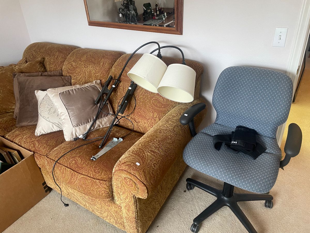 Couches, 4 poster bed, high boy, designer purses, designer clothing (size 10-16), quilts, sheets vintage China cabinets and display, desk, marble chess game, radiant heat fire enclosure, flower pots, rocking chairs, pits and pans,