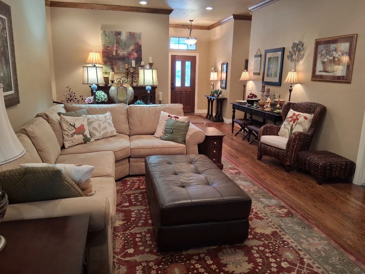 This home is packed with beautiful items! Furniture- 3 PC mid-sz sectional, lighted display cabinets, sofa tables, dining room table and chairs, 2 fridges, front loaders washer/ dryer, bedroom suites, lamps, jewelry, watches, tons of high end clothing, shoes, and purses. Electronics, dinnerware and kitchen appliances. Rugs, wicker furniture, art, and so much more!