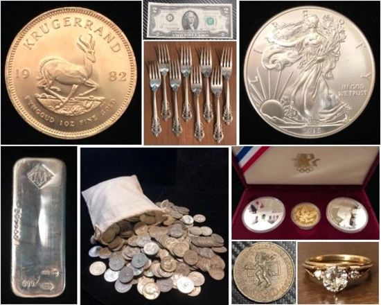 Online Auction Only! Second and Final Auction from this amazing lifetime estate collection of Gold and Silver Bullion and Coins, featuring South Africa 1oz Gold Krugerrands, 5 Johnson Matthey 100 oz Silver Ingots, brilliant A-Mark silver rounds, large amounts of 90% Silver Washington Quarters, stunning Vintage Sterling Silverware, Fine Jewelry including gold, silver, diamonds and other precious gems, Standing Liberty Quarters, American Silver Eagles, a nice collection of World Currency and Coins, and more! Auction begins closing Sunday, November 10th at 2pm Pick Up Date & Time: Monday, November 11th from 1 to 5pm. For more information please call: Linda...
