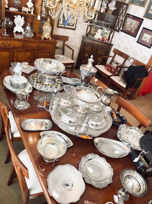 Additional photos will be uploaded daily. Marquetry design antique corner cabinet, 16 sterling silver goblets, sterling tea service, sterling trays, bowls, flatware, candlesticks, S & P shakers, & more. Gold & silver jewelry, watches, bolo ties, Brooches, vintage / Antique costume jewelry. 8’ Golden west billiards pool table, oak pool que holder, kindel dinning room suite w/hutch, Thomasville end tables, Fairfield tufted armchairs, Drexel sofa, 5pc French prov. Bedroom suite, two twin beds. Queen sized poster bed, 4pc Henredon bedroom suite, large pub table w/two chairs, large executives desk, Two Victorian leather chairs, sofa tables, antique brass & onyx stand,...