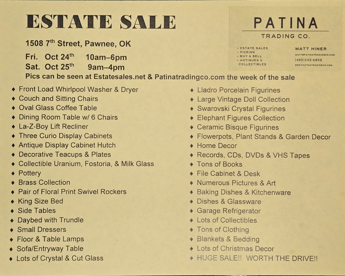 ESTATE SALE THIS WEEKEND IN PAWNEE THIS IS A HUGE SALE!! WORTH THE DRIVE! Address: 1508 7th Street, Pawnee, OK Friday, 10/24: 10am - 6pm, Saturday, 10/25: 9am - 4pm, Front Load Whirlpool Washer & Dryer, Couch & Arm Chairs, Oval Glass Coffee Table, Dining Room Table w/ 6 Chairs, La-Z-Boy Lift Recliner, Three Curio Display Cabinets, Antique Display Cabinet Hutch, Decorative Teacups & Plates, Collectible Uranium, Fostoria & Milk Glass, Pottery, Brass Collection, Pair of Floral Print Swivel Rockers, King Size Bed, Side Tables, Daybed w/ Trundle, Small Dressers, Floor & Table Lamps, Sofa/Entryway Table, Lots of Crystal &...